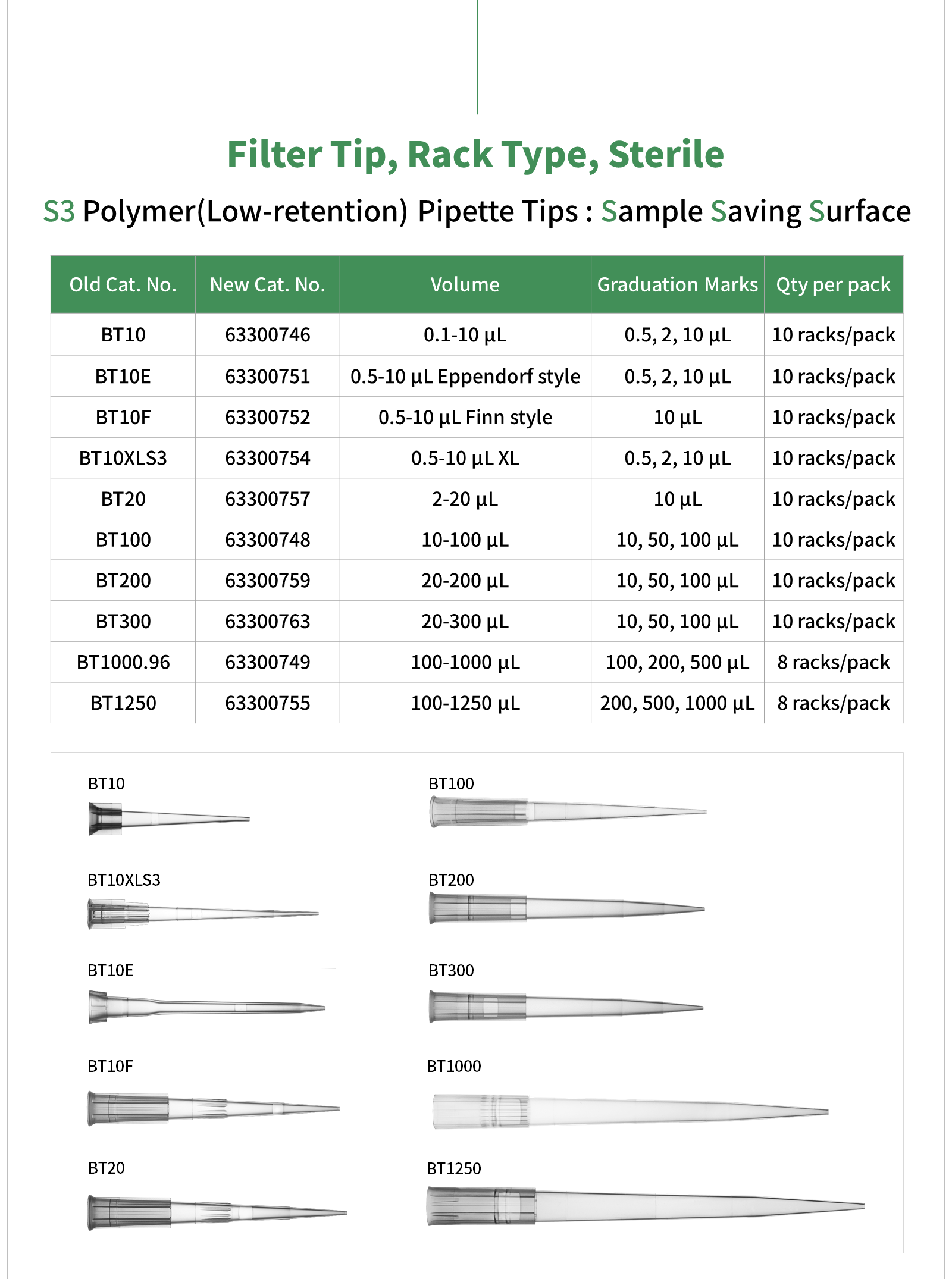 | BT10 | 63300746 | 0.1–10 µL | 0.5, 2, 10 µL | 10 racks/pack |