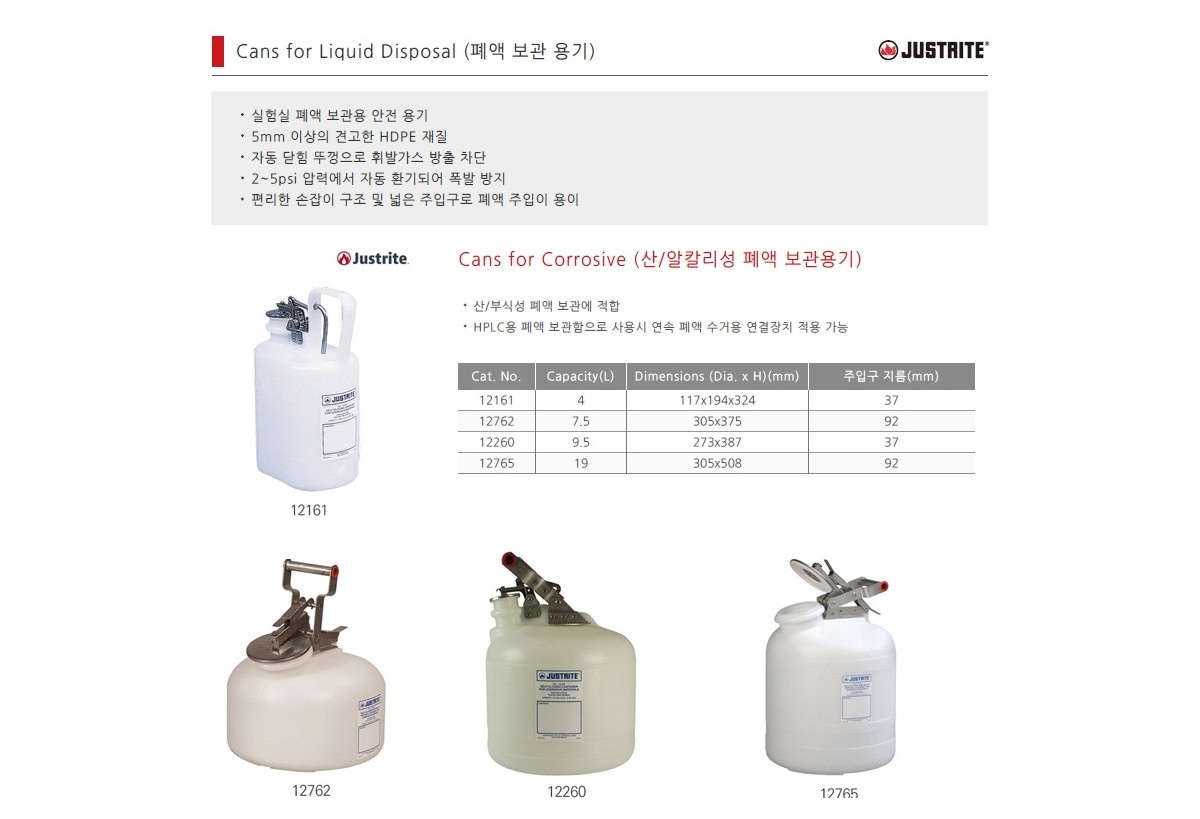 Justrite 산/부식성 폐액 안전보관 용기 (Cat. No. 12161)