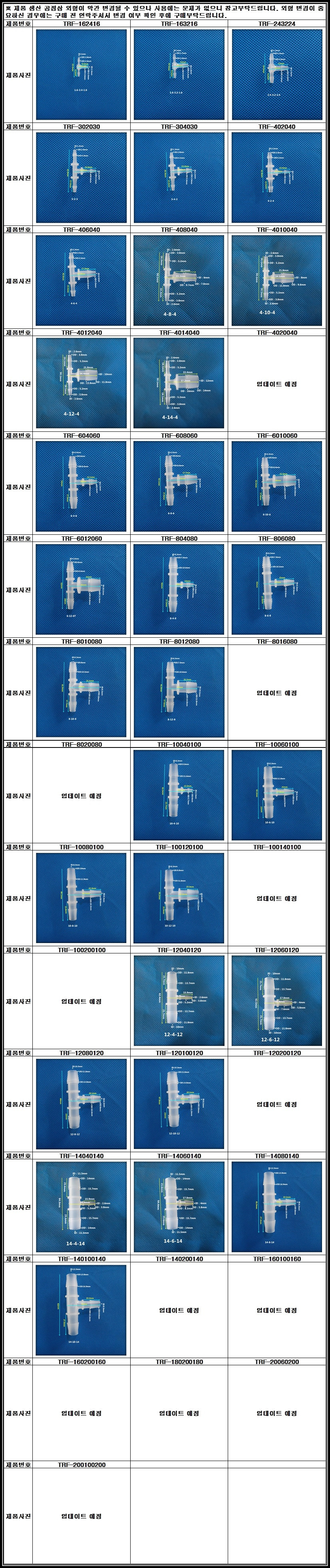 | TRF-14060140 | 14.0mm ID Tubing 2 parts & 6.0mm ID Tubing 1 part | 10개/팩 |