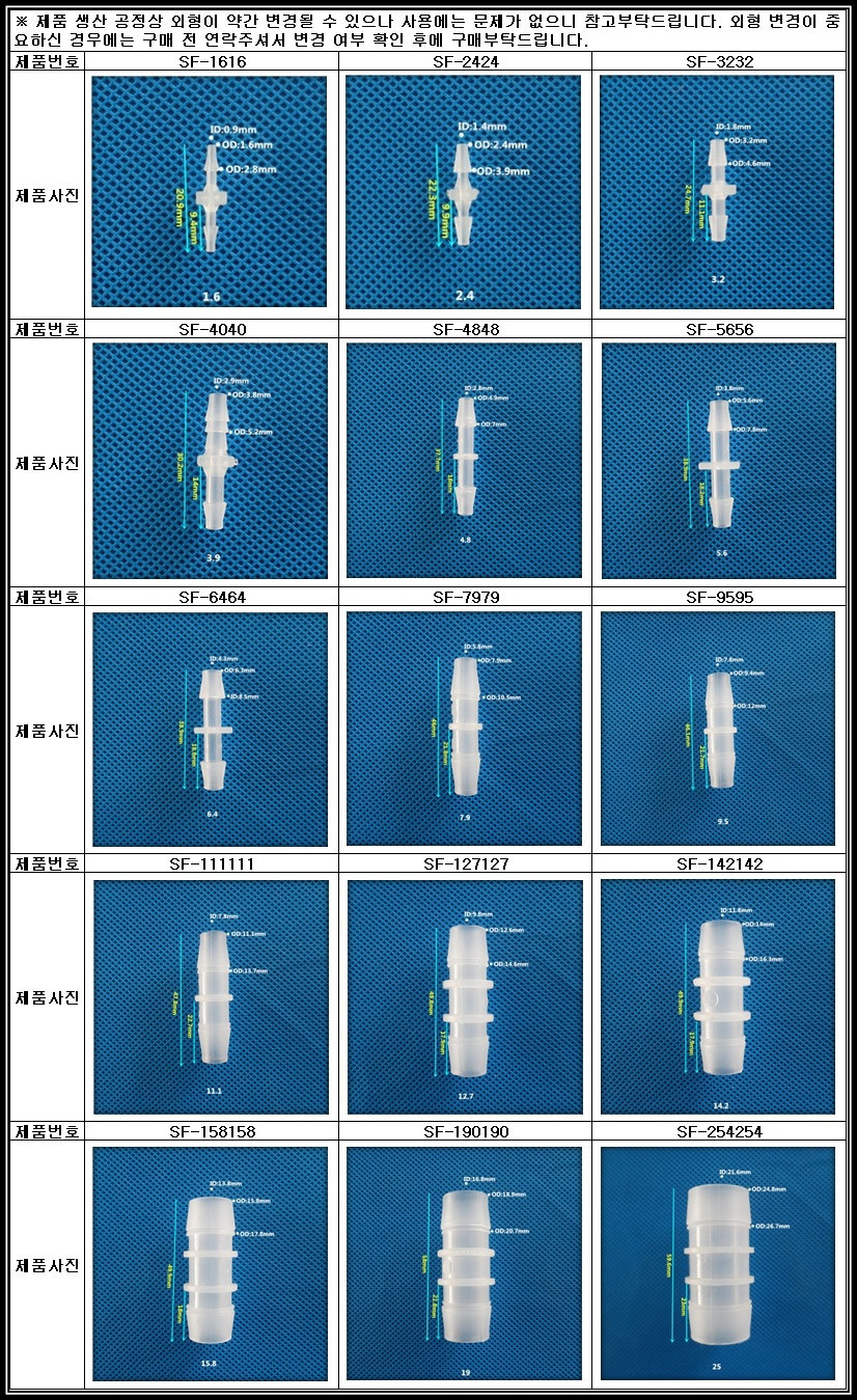 | SF-1616 | Straight Through Tube Fitting, 1/16" (1.6 mm) ID Tubing, PP(Polypropylene) | 10개/팩 |