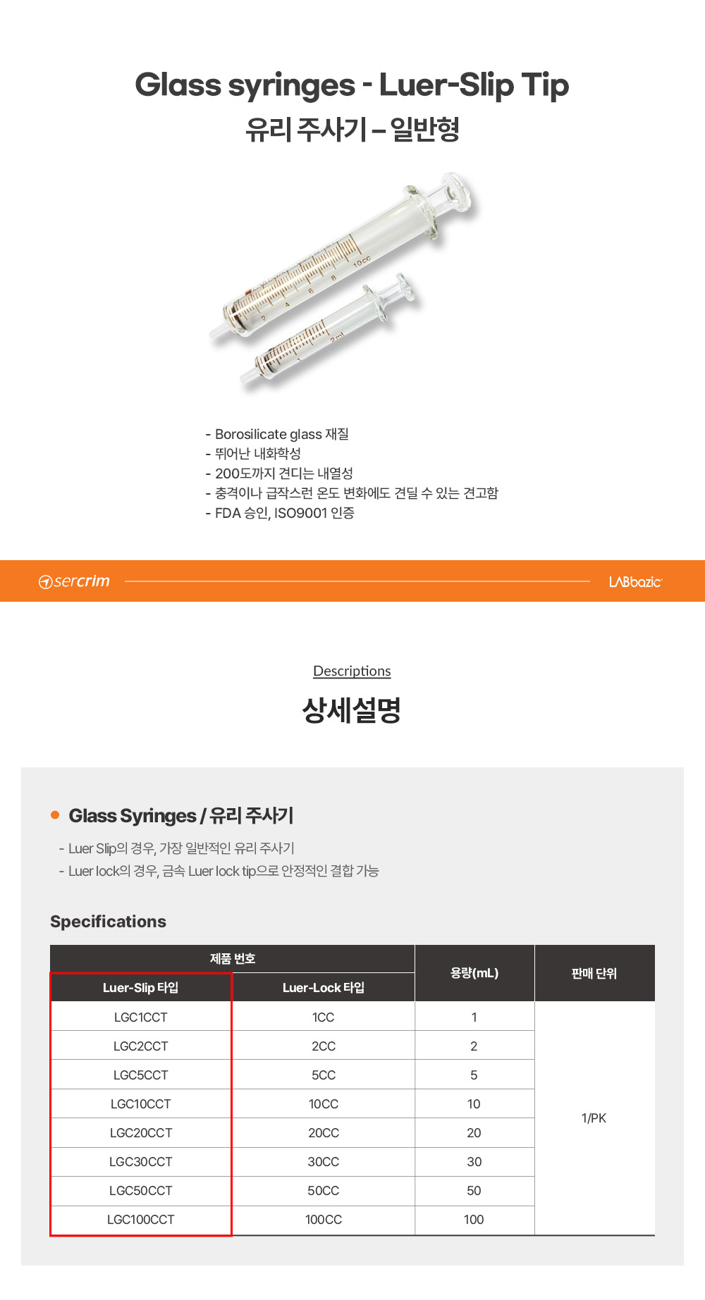 | 제품 번호 | Luer-Slip 타입 | Luer-Lock 타입 | 용량 (mL) | 판매 단위 |