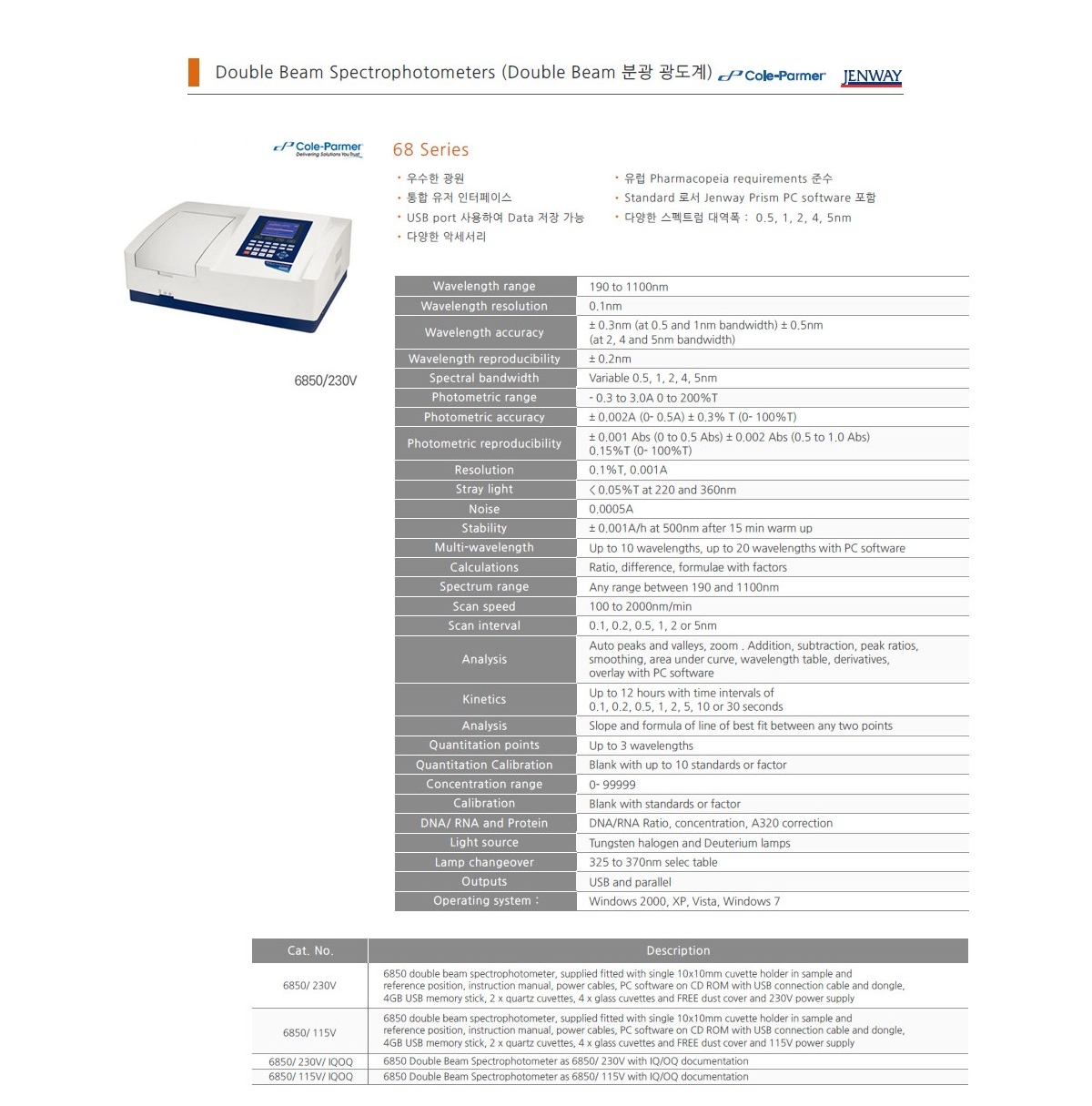 Cole-Parmer 6850은 Variable Bandwidth Double Beam 분광광도계로, 190~1100nm 범위의 정밀 측정과 다양한 스캔 및 분석 기능을 제공합니다. USB 데이터 저장, Jenway Prism PC 소프트웨어 포함, 유럽 Pharmacopeia 기준 준수, 연구·제약·환경 분석에 적합.