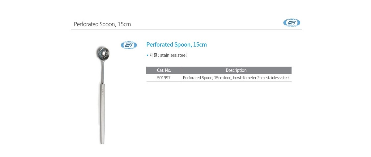 WPI의 Perforated Spoon은 스테인리스 스틸 재질로 제작된 정밀 실험용 스푼입니다. 15cm 길이와 2cm 볼 직경으로 견고하고 내식성이 뛰어나며, 액체나 시료 취급 시 효율적입니다. 생명과학 및 신경과학 연구에 적합한 고품질 실험 도구입니다.