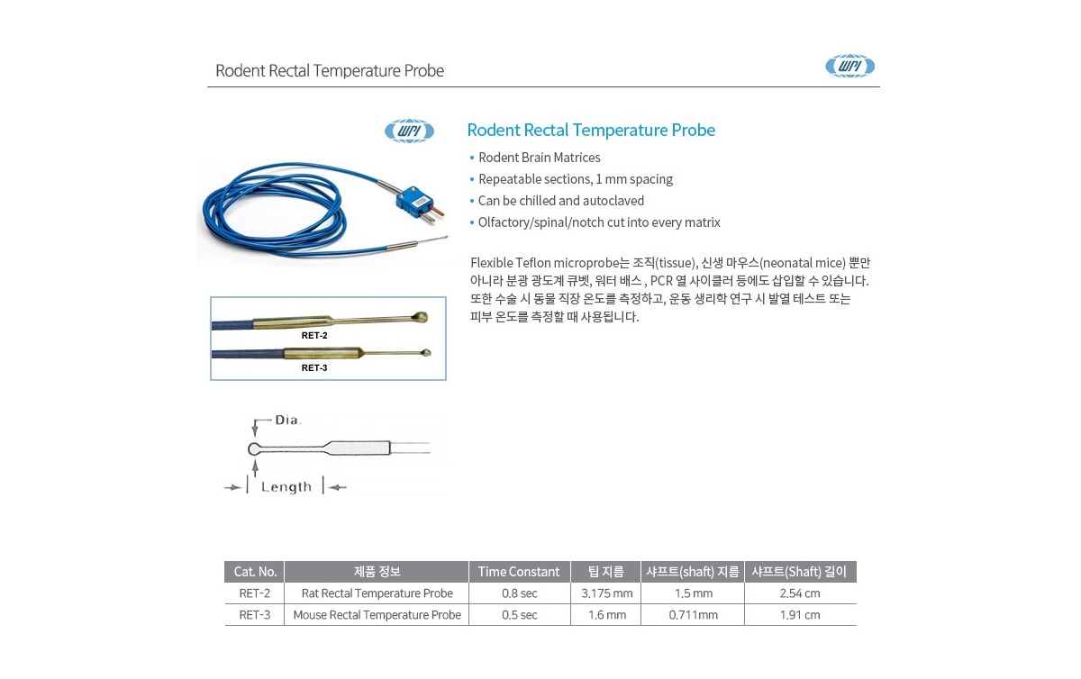 WPI RET-3 / 설치류 온도 프로브(Rodent Rectal Temperature Probe), MICE, 흰쥐용[1EA]