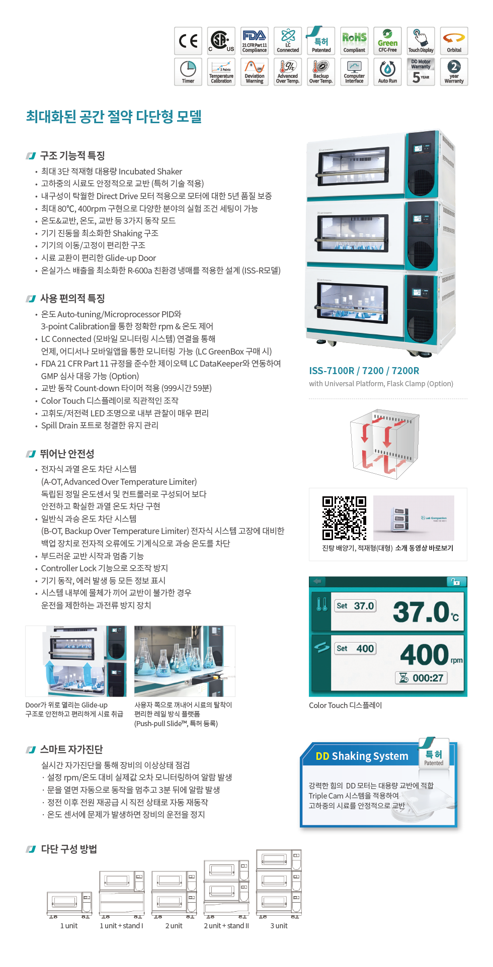 최대 3단 적재형 대용량 진탕 배양기로 공간 효율 극대화. Direct Drive 모터로 고하중 안정 교반 및 5년 품질 보증. Auto-tuning PID 제어와 모바일 모니터링 지원. A-OT/B-OT 이중 과열 차단으로 안전성 강화. 친환경 냉매 적용(ISS-R 모델).