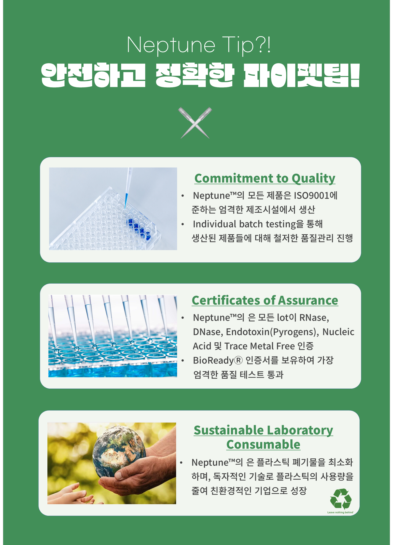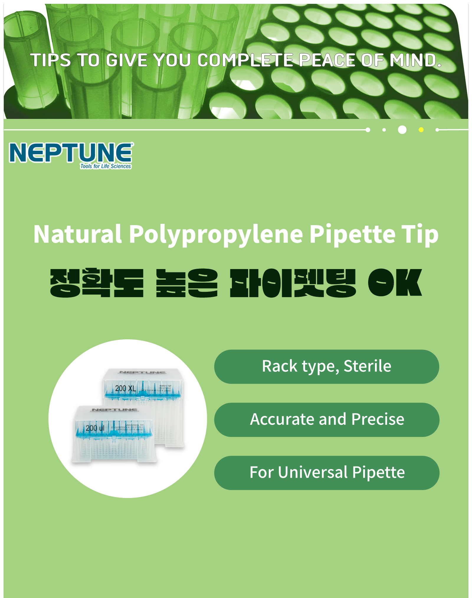 정확하고 신뢰성 높은 피펫팅을 위한 NEPTUNE의 멸균 파이펫 팁은 다양한 파이펫과 호환되며, 친환경 소재로 제작되었습니다. ISO9001 수준의 품질관리와 BioReady® 인증을 통해 실험의 정확성과 재현성을 보장합니다.