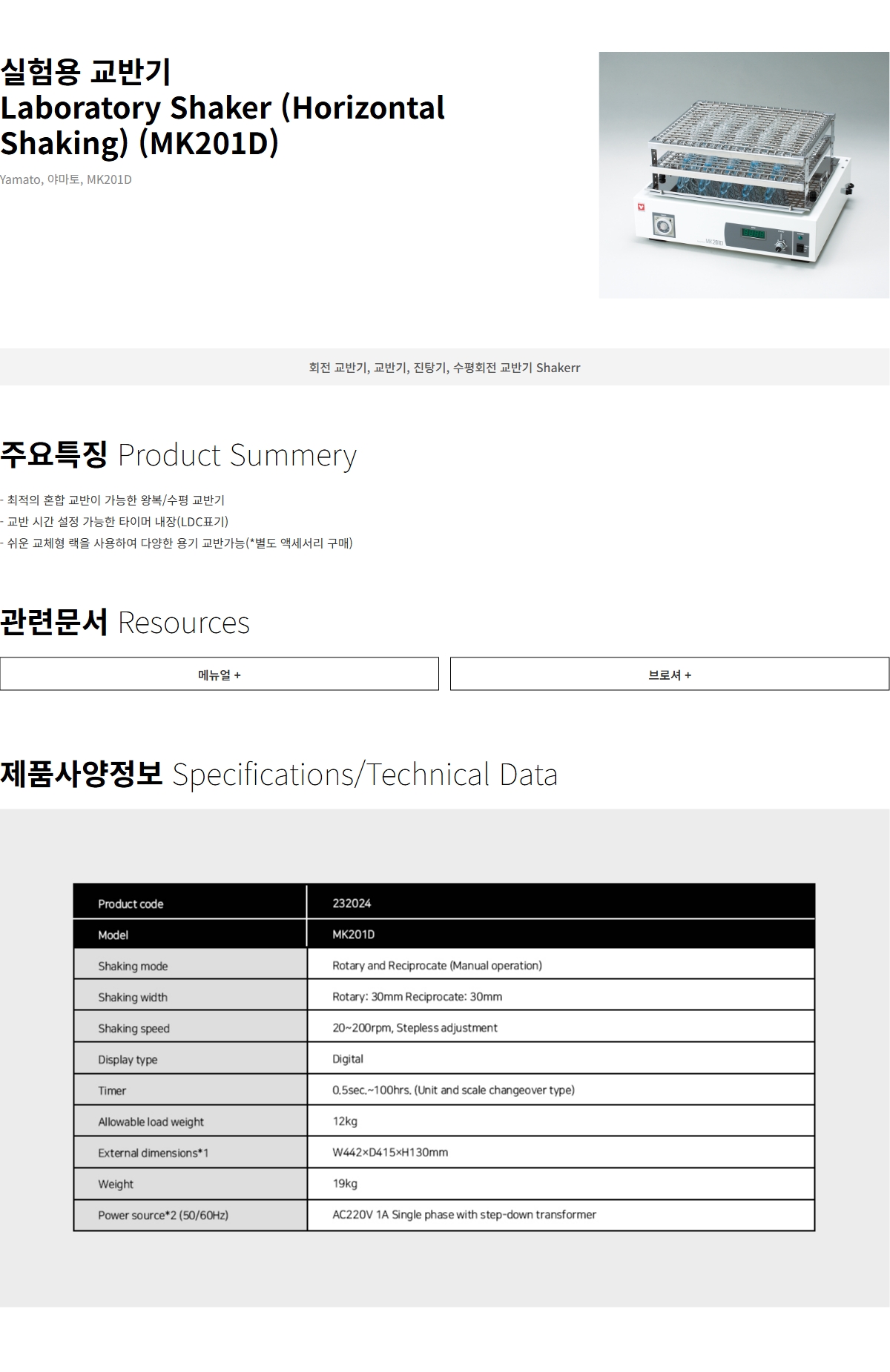 야마토(Yamato) MK201D 실험용 수평 교반기로 20~200rpm의 정밀 속도 제어가 가능하며, 왕복 및 회전 교반 기능을 갖춘 다목적 진탕기입니다. 타이머 내장과 디지털 표시로 사용 편의성을 높였으며, 다양한 용기 교반이 가능합니다.