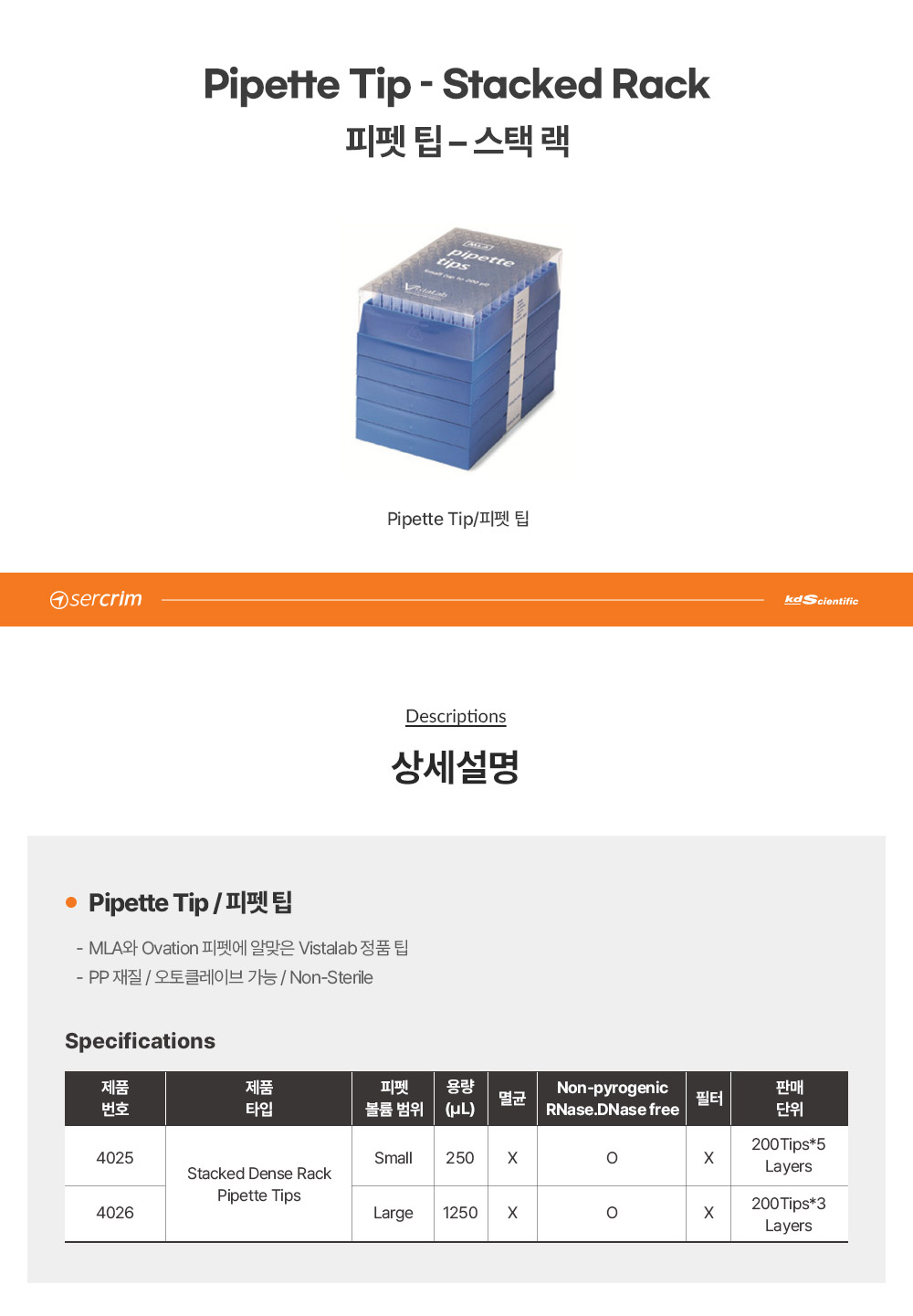 Vistalab 9025 / 피펫 팁(Pipette tip) Stacked Rack MLA Stacked,5-200ul(250ul Capacity),200tips×5[1000EA/PK]